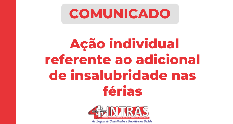 O Sindicato dos Trabalhadores em Saúde do Estado do Tocantins (Sintras) informa que, além da Ação Coletiva já em andamento, os filiados que desejarem também podem ingressar com ação individual para garantir o recebimento do adicional de insalubridade durante o período de férias.