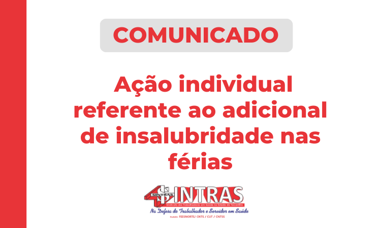O Sindicato dos Trabalhadores em Saúde do Estado do Tocantins (Sintras) informa que, além da Ação Coletiva já em andamento, os filiados que desejarem também podem ingressar com ação individual para garantir o recebimento do adicional de insalubridade durante o período de férias.