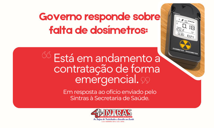 O Sindicato dos Trabalhadores em Saúde do Estado do Tocantins (Sintras-TO) recebeu resposta da Secretaria de Estado da Saúde (SES-TO) sobre a falta de dosímetros para profissionais da radiologia nas unidades hospitalares estaduais. De acordo com o órgão, está em andamento a contratação emergencial de empresa especializada para prestação de serviços de monitoramento radiológico pessoal, com fornecimento de dosímetros individuais para trabalhadores expostos à radiação ionizante.